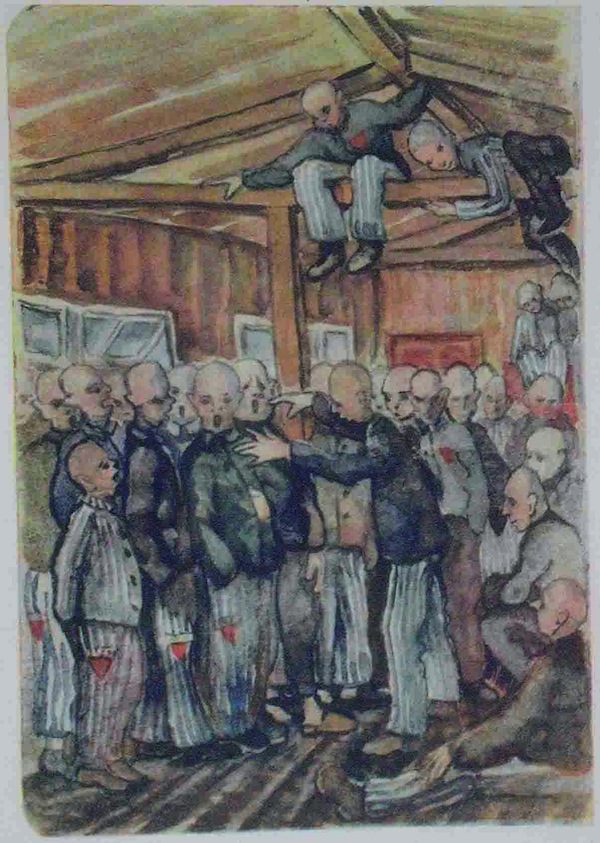 In 1942 in Dachau, an evening of song given by the Czechoslovakian camp choir was recorded in this drawing by Vladimir Matejka. The huge crowd enjoying this rare musical treat shows clearly how important it was for prisoners to be able to organize a musical performance like this (published in Kopf hoch, Kamerad! Künstlerische Dokumente aus faschistischen Konzentrationslagern, ed. Deutsche Akademie der Künste zu Berlin, 2d ed. (Berlin, 1966), ill. 21).